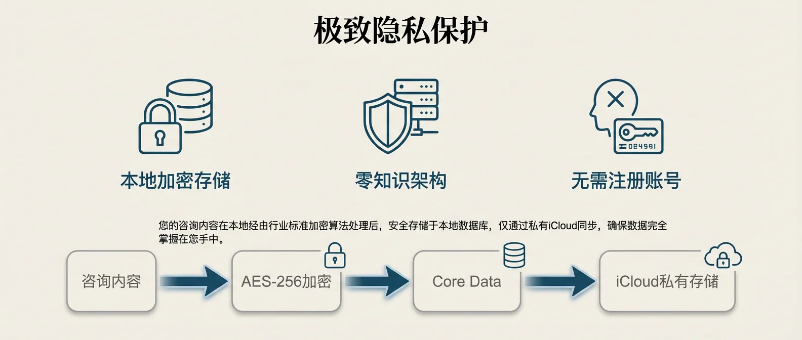 绝对安全。所有数据使用 AES-256 加密存储在您的设备本地,我们采用零知识架构,无法访问您的任何咨询内容。即使使用 iCloud 同步,数据也是端到端加密的。